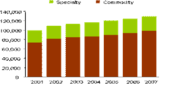 統(tǒng)計(jì)數(shù)據(jù)表明,美國(guó)家用電腦和打印機(jī)的普及培育了桌面噴墨打印的市場(chǎng),2004年噴墨方式輸出的1160億張打印紙中,特殊打印介質(zhì)將近300億張,預(yù)期2002年至2007年間普通噴墨打印紙和特殊打印介質(zhì)均會(huì)有穩(wěn)定增長(zhǎng),這段時(shí)間內(nèi),噴墨打印介質(zhì)的打印數(shù)量年度遞增率(CAGR)為3.5%。2004年美國(guó)整個(gè)噴墨介質(zhì)的收入超過(guò)32億美元,其中普通產(chǎn)品約17億美元,透明片或其它膠片薄膜產(chǎn)品0.5219億美元,特殊打印介質(zhì)超過(guò)13億美元。雖然普通產(chǎn)品(commodity)仍是噴墨打印的主要輸出對(duì)象,數(shù)量上占了總噸數(shù)的75%,但由于價(jià)格低,其銷售額只占總銷售額的40%。 2005年預(yù)期桌面噴墨打印的總量將超過(guò)1202億張,市場(chǎng)份額33億美元。2002-2007年間預(yù)期噴墨打印紙的銷售額年遞增率2.4%。特殊打印介質(zhì)包括彩噴紙(Coated paper),照片打印紙(Photo paper),明信片紙,背膠,油畫(huà)紙,標(biāo)簽紙等等。在特殊打印介質(zhì)的增長(zhǎng)中,彩噴紙的增長(zhǎng)速度相比較慢,而照片打印紙?jiān)鲩L(zhǎng)速度很快,預(yù)計(jì)2002-2007年間照片打印紙的年遞增率將高達(dá)16%!這種增長(zhǎng)歸功于低價(jià)位數(shù)碼相機(jī)的熱銷;低于50美元打印機(jī)的銷售;和數(shù)字圖像傳輸?shù)目旖菪浴?/span>
