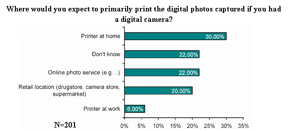 2004年1月市場(chǎng)研究公司InfoTrends發(fā)表的CAP ventures和“Digital Output Magazine” 聯(lián)合開(kāi)展的公司用戶調(diào)查結(jié)果,回答近期內(nèi)公司準(zhǔn)備采購(gòu)何種數(shù)碼打印設(shè)備時(shí),56.8%的公司準(zhǔn)備采購(gòu)超過(guò)24英寸的寬幅噴墨打印機(jī),32.6%的公司準(zhǔn)備采購(gòu)桌面噴墨打印機(jī),桌面彩色激光打印機(jī)的采購(gòu)傾向用戶15.2%, 可見(jiàn)噴墨在該領(lǐng)域占主導(dǎo)地位,這種狀況在一定時(shí)間內(nèi)延續(xù)下去。