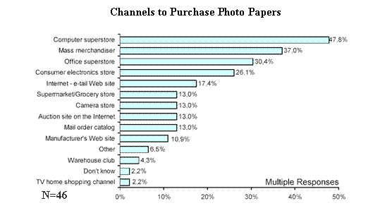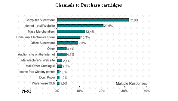 調(diào)查機(jī)構(gòu)發(fā)現(xiàn):用戶購(gòu)買照片墨水和介質(zhì)的渠道有較大區(qū)別,雖然電腦超市都是用戶最常去的場(chǎng)所,但墨水的銷售很多是通過(guò)Internet和大型超市實(shí)現(xiàn)的,而介質(zhì)通過(guò)Internet網(wǎng)的銷售方式僅排第5位,大量用戶選擇在大型超市、辦公品商場(chǎng)購(gòu)買。用戶選擇在辦公品商場(chǎng)購(gòu)買墨水的比例僅占9.3%。上述區(qū)別的原因可能是:用戶對(duì)墨水品質(zhì)保證的關(guān)注程度高于介質(zhì),顯而易見(jiàn)相比于介質(zhì),墨水對(duì)打印機(jī)可能能造成更大的傷害。