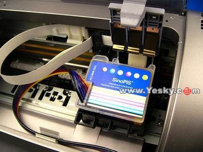 無海綿墨盒配以硅膠管線和各色外墨盒蓋,組成連續供墨系統的內部部分,當然也少不了永久長效芯片。
