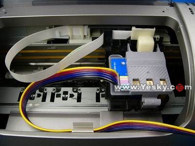 通過這樣的設計,可以使用墨盒所帶的原裝的墨盒蓋,這樣使得系統的穩定性進一步提高,另外這種走線也可以讓打印機的蓋子蓋上有效的防塵,提高打印機的使用壽命和打印質量
