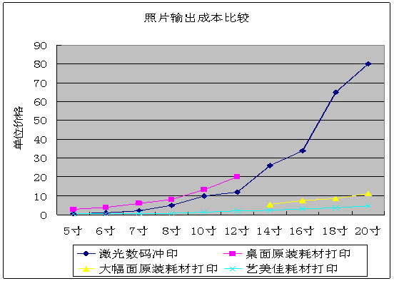 從上圖就可以看出,照片打印機和基于照片打印的多功能打印機,每年都以30%以上的速度增長,僅美國市場,2005年預計裝機量就達到2000萬臺以上,2008年可達3000多萬臺。 相比于數碼激光,照片的噴墨打印輸出至少有如下優勢:方便、隨意性強:因為完全在家庭、辦公室實現,可大可小、可多可少,隨時隨地、隨心所欲。私密性好:用不著將數碼文件交給別人,也用不著從他人處取回,不想讓人見的,別人永遠見不到。DIY,樂趣無窮:不管是對于專業人士,還是對于數碼發燒友,完全可以陶醉于從拍照、編輯修改到打印輸出的無窮樂趣。環保:不再用銀鹽等稀缺資源,也擺脫了藥水使用與排放對于環境的污染。持久不退色:噴墨打印墨水分為染料和顏料兩大類,如果使用顏料墨水打印出的照片,比傳統的銀鹽感光照片能夠保存更長的時間而不退色。 噴墨打印技術不斷發展,墨水和打印介質品質也在不斷提高,從技術的角度來看,水性顏料墨水+RC間隙型防水高光相紙是照片噴墨的主流方向。不但質感、影像品質方面毫不遜色于銀鹽感光照片,而且在光線耐牢度、方便性、設備投入等方面明顯優于感光照片。 可能唯一的問題是成本,有的人會抱怨,噴墨打印的成本高,是的,以EPSON照片級噴墨打印機,打印在原裝EPSON高質量光澤照片紙上為例,打印一張6寸的照片,成本會在3元以上,而在外面的沖印店里,激光數碼沖印的報價只有一塊左右。定位于專業應用的大幅面打印機打印(24英寸到44英寸寬)成本會低很多,因為桌面打印機墨盒中的墨水,平均每毫升價值10塊人民幣左右,大幅面打印機墨盒的容量更大,平均每毫升2元上下。從下圖就可以看出,用專業大幅面打印機打印照片,成本就已經遠遠低于激光數碼沖印的價格,但是這些打印機并不是給家庭使用的,像激光數碼沖印一樣,是給專業的影像服務機構使用的。